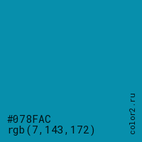 Цвет #078FAC в цветовой модели RGB обозначается тремя октетами (7, 143, 172) в десятичном формате и #078FAC в шестнадцатиричном (hex) формате, которые являются интенсивностью красного 7 (hex 07), интенсивность зелёного 143 (hex 8F) и интенсивность синего 172 (hex AC).