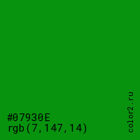 Цвет #07930E в цветовой модели RGB обозначается тремя октетами (7, 147, 14) в десятичном формате и #07930E в шестнадцатиричном (hex) формате, которые являются интенсивностью красного 7 (hex 07), интенсивность зелёного 147 (hex 93) и интенсивность синего 14 (hex 0E).