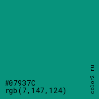 Цвет #07937C в цветовой модели RGB обозначается тремя октетами (7, 147, 124) в десятичном формате и #07937C в шестнадцатиричном (hex) формате, которые являются интенсивностью красного 7 (hex 07), интенсивность зелёного 147 (hex 93) и интенсивность синего 124 (hex 7C).