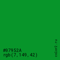 Цвет #07952A в цветовой модели RGB обозначается тремя октетами (7, 149, 42) в десятичном формате и #07952A в шестнадцатиричном (hex) формате, которые являются интенсивностью красного 7 (hex 07), интенсивность зелёного 149 (hex 95) и интенсивность синего 42 (hex 2A).
