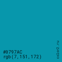 Цвет #0797AC в цветовой модели RGB обозначается тремя октетами (7, 151, 172) в десятичном формате и #0797AC в шестнадцатиричном (hex) формате, которые являются интенсивностью красного 7 (hex 07), интенсивность зелёного 151 (hex 97) и интенсивность синего 172 (hex AC).