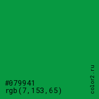 Цвет #079941 в цветовой модели RGB обозначается тремя октетами (7, 153, 65) в десятичном формате и #079941 в шестнадцатиричном (hex) формате, которые являются интенсивностью красного 7 (hex 07), интенсивность зелёного 153 (hex 99) и интенсивность синего 65 (hex 41).
