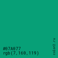 Цвет #07A077 в цветовой модели RGB обозначается тремя октетами (7, 160, 119) в десятичном формате и #07A077 в шестнадцатиричном (hex) формате, которые являются интенсивностью красного 7 (hex 07), интенсивность зелёного 160 (hex A0) и интенсивность синего 119 (hex 77).