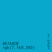 Цвет #07A8CB в цветовой модели RGB обозначается тремя октетами (7, 168, 203) в десятичном формате и #07A8CB в шестнадцатиричном (hex) формате, которые являются интенсивностью красного 7 (hex 07), интенсивность зелёного 168 (hex A8) и интенсивность синего 203 (hex CB).