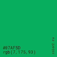 Цвет #07AF5D в цветовой модели RGB обозначается тремя октетами (7, 175, 93) в десятичном формате и #07AF5D в шестнадцатиричном (hex) формате, которые являются интенсивностью красного 7 (hex 07), интенсивность зелёного 175 (hex AF) и интенсивность синего 93 (hex 5D).