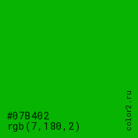 Цвет #07B402 в цветовой модели RGB обозначается тремя октетами (7, 180, 2) в десятичном формате и #07B402 в шестнадцатиричном (hex) формате, которые являются интенсивностью красного 7 (hex 07), интенсивность зелёного 180 (hex B4) и интенсивность синего 2 (hex 02).