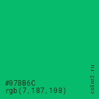 Цвет #07BB6C в цветовой модели RGB обозначается тремя октетами (7, 187, 108) в десятичном формате и #07BB6C в шестнадцатиричном (hex) формате, которые являются интенсивностью красного 7 (hex 07), интенсивность зелёного 187 (hex BB) и интенсивность синего 108 (hex 6C).