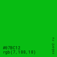 Цвет #07BC12 в цветовой модели RGB обозначается тремя октетами (7, 188, 18) в десятичном формате и #07BC12 в шестнадцатиричном (hex) формате, которые являются интенсивностью красного 7 (hex 07), интенсивность зелёного 188 (hex BC) и интенсивность синего 18 (hex 12).