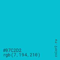 Цвет #07C2D2 в цветовой модели RGB обозначается тремя октетами (7, 194, 210) в десятичном формате и #07C2D2 в шестнадцатиричном (hex) формате, которые являются интенсивностью красного 7 (hex 07), интенсивность зелёного 194 (hex C2) и интенсивность синего 210 (hex D2).