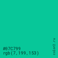 Цвет #07C799 в цветовой модели RGB обозначается тремя октетами (7, 199, 153) в десятичном формате и #07C799 в шестнадцатиричном (hex) формате, которые являются интенсивностью красного 7 (hex 07), интенсивность зелёного 199 (hex C7) и интенсивность синего 153 (hex 99).