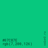 Цвет #07C87E в цветовой модели RGB обозначается тремя октетами (7, 200, 126) в десятичном формате и #07C87E в шестнадцатиричном (hex) формате, которые являются интенсивностью красного 7 (hex 07), интенсивность зелёного 200 (hex C8) и интенсивность синего 126 (hex 7E).