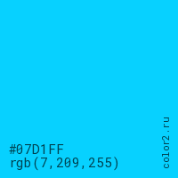 Цвет #07D1FF в цветовой модели RGB обозначается тремя октетами (7, 209, 255) в десятичном формате и #07D1FF в шестнадцатиричном (hex) формате, которые являются интенсивностью красного 7 (hex 07), интенсивность зелёного 209 (hex D1) и интенсивность синего 255 (hex FF).