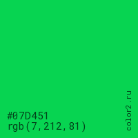 Цвет #07D451 в цветовой модели RGB обозначается тремя октетами (7, 212, 81) в десятичном формате и #07D451 в шестнадцатиричном (hex) формате, которые являются интенсивностью красного 7 (hex 07), интенсивность зелёного 212 (hex D4) и интенсивность синего 81 (hex 51).