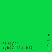 Цвет #07D744 в цветовой модели RGB обозначается тремя октетами (7, 215, 68) в десятичном формате и #07D744 в шестнадцатиричном (hex) формате, которые являются интенсивностью красного 7 (hex 07), интенсивность зелёного 215 (hex D7) и интенсивность синего 68 (hex 44).