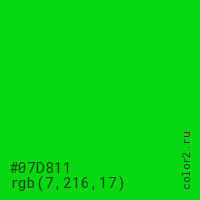 Цвет #07D811 в цветовой модели RGB обозначается тремя октетами (7, 216, 17) в десятичном формате и #07D811 в шестнадцатиричном (hex) формате, которые являются интенсивностью красного 7 (hex 07), интенсивность зелёного 216 (hex D8) и интенсивность синего 17 (hex 11).