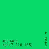 Цвет #07DA69 в цветовой модели RGB обозначается тремя октетами (7, 218, 105) в десятичном формате и #07DA69 в шестнадцатиричном (hex) формате, которые являются интенсивностью красного 7 (hex 07), интенсивность зелёного 218 (hex DA) и интенсивность синего 105 (hex 69).