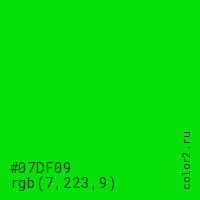 Цвет #07DF09 в цветовой модели RGB обозначается тремя октетами (7, 223, 9) в десятичном формате и #07DF09 в шестнадцатиричном (hex) формате, которые являются интенсивностью красного 7 (hex 07), интенсивность зелёного 223 (hex DF) и интенсивность синего 9 (hex 09).