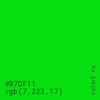 Цвет #07DF11 в цветовой модели RGB обозначается тремя октетами (7, 223, 17) в десятичном формате и #07DF11 в шестнадцатиричном (hex) формате, которые являются интенсивностью красного 7 (hex 07), интенсивность зелёного 223 (hex DF) и интенсивность синего 17 (hex 11).