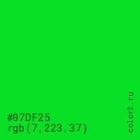 Цвет #07DF25 в цветовой модели RGB обозначается тремя октетами (7, 223, 37) в десятичном формате и #07DF25 в шестнадцатиричном (hex) формате, которые являются интенсивностью красного 7 (hex 07), интенсивность зелёного 223 (hex DF) и интенсивность синего 37 (hex 25).