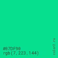 Цвет #07DF90 в цветовой модели RGB обозначается тремя октетами (7, 223, 144) в десятичном формате и #07DF90 в шестнадцатиричном (hex) формате, которые являются интенсивностью красного 7 (hex 07), интенсивность зелёного 223 (hex DF) и интенсивность синего 144 (hex 90).