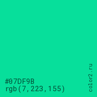 Цвет #07DF9B в цветовой модели RGB обозначается тремя октетами (7, 223, 155) в десятичном формате и #07DF9B в шестнадцатиричном (hex) формате, которые являются интенсивностью красного 7 (hex 07), интенсивность зелёного 223 (hex DF) и интенсивность синего 155 (hex 9B).