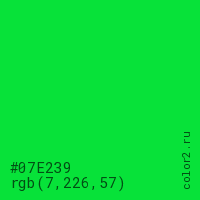 Цвет #07E239 в цветовой модели RGB обозначается тремя октетами (7, 226, 57) в десятичном формате и #07E239 в шестнадцатиричном (hex) формате, которые являются интенсивностью красного 7 (hex 07), интенсивность зелёного 226 (hex E2) и интенсивность синего 57 (hex 39).