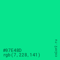 Цвет #07E48D в цветовой модели RGB обозначается тремя октетами (7, 228, 141) в десятичном формате и #07E48D в шестнадцатиричном (hex) формате, которые являются интенсивностью красного 7 (hex 07), интенсивность зелёного 228 (hex E4) и интенсивность синего 141 (hex 8D).
