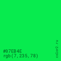 Цвет #07EB4E в цветовой модели RGB обозначается тремя октетами (7, 235, 78) в десятичном формате и #07EB4E в шестнадцатиричном (hex) формате, которые являются интенсивностью красного 7 (hex 07), интенсивность зелёного 235 (hex EB) и интенсивность синего 78 (hex 4E).