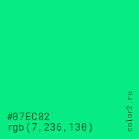 Цвет #07EC82 в цветовой модели RGB обозначается тремя октетами (7, 236, 130) в десятичном формате и #07EC82 в шестнадцатиричном (hex) формате, которые являются интенсивностью красного 7 (hex 07), интенсивность зелёного 236 (hex EC) и интенсивность синего 130 (hex 82).