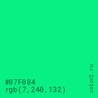 Цвет #07F084 в цветовой модели RGB обозначается тремя октетами (7, 240, 132) в десятичном формате и #07F084 в шестнадцатиричном (hex) формате, которые являются интенсивностью красного 7 (hex 07), интенсивность зелёного 240 (hex F0) и интенсивность синего 132 (hex 84).