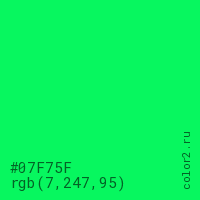 Цвет #07F75F в цветовой модели RGB обозначается тремя октетами (7, 247, 95) в десятичном формате и #07F75F в шестнадцатиричном (hex) формате, которые являются интенсивностью красного 7 (hex 07), интенсивность зелёного 247 (hex F7) и интенсивность синего 95 (hex 5F).