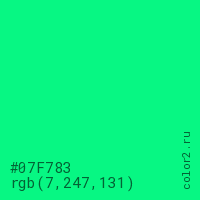 Цвет #07F783 в цветовой модели RGB обозначается тремя октетами (7, 247, 131) в десятичном формате и #07F783 в шестнадцатиричном (hex) формате, которые являются интенсивностью красного 7 (hex 07), интенсивность зелёного 247 (hex F7) и интенсивность синего 131 (hex 83).
