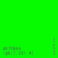Цвет #07FB04 в цветовой модели RGB обозначается тремя октетами (7, 251, 4) в десятичном формате и #07FB04 в шестнадцатиричном (hex) формате, которые являются интенсивностью красного 7 (hex 07), интенсивность зелёного 251 (hex FB) и интенсивность синего 4 (hex 04).