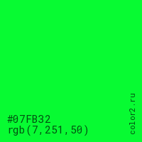 Цвет #07FB32 в цветовой модели RGB обозначается тремя октетами (7, 251, 50) в десятичном формате и #07FB32 в шестнадцатиричном (hex) формате, которые являются интенсивностью красного 7 (hex 07), интенсивность зелёного 251 (hex FB) и интенсивность синего 50 (hex 32).
