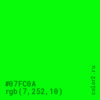 Цвет #07FC0A в цветовой модели RGB обозначается тремя октетами (7, 252, 10) в десятичном формате и #07FC0A в шестнадцатиричном (hex) формате, которые являются интенсивностью красного 7 (hex 07), интенсивность зелёного 252 (hex FC) и интенсивность синего 10 (hex 0A).