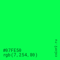 Цвет #07FE50 в цветовой модели RGB обозначается тремя октетами (7, 254, 80) в десятичном формате и #07FE50 в шестнадцатиричном (hex) формате, которые являются интенсивностью красного 7 (hex 07), интенсивность зелёного 254 (hex FE) и интенсивность синего 80 (hex 50).