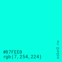 Цвет #07FEE0 в цветовой модели RGB обозначается тремя октетами (7, 254, 224) в десятичном формате и #07FEE0 в шестнадцатиричном (hex) формате, которые являются интенсивностью красного 7 (hex 07), интенсивность зелёного 254 (hex FE) и интенсивность синего 224 (hex E0).