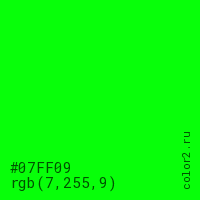 Цвет #07FF09 в цветовой модели RGB обозначается тремя октетами (7, 255, 9) в десятичном формате и #07FF09 в шестнадцатиричном (hex) формате, которые являются интенсивностью красного 7 (hex 07), интенсивность зелёного 255 (hex FF) и интенсивность синего 9 (hex 09).