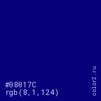 Цвет #08017C в цветовой модели RGB обозначается тремя октетами (8, 1, 124) в десятичном формате и #08017C в шестнадцатиричном (hex) формате, которые являются интенсивностью красного 8 (hex 08), интенсивность зелёного 1 (hex 01) и интенсивность синего 124 (hex 7C).
