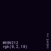 Цвет #080212 в цветовой модели RGB обозначается тремя октетами (8, 2, 18) в десятичном формате и #080212 в шестнадцатиричном (hex) формате, которые являются интенсивностью красного 8 (hex 08), интенсивность зелёного 2 (hex 02) и интенсивность синего 18 (hex 12).