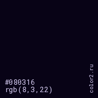 Цвет #080316 в цветовой модели RGB обозначается тремя октетами (8, 3, 22) в десятичном формате и #080316 в шестнадцатиричном (hex) формате, которые являются интенсивностью красного 8 (hex 08), интенсивность зелёного 3 (hex 03) и интенсивность синего 22 (hex 16).