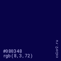 Цвет #080348 в цветовой модели RGB обозначается тремя октетами (8, 3, 72) в десятичном формате и #080348 в шестнадцатиричном (hex) формате, которые являются интенсивностью красного 8 (hex 08), интенсивность зелёного 3 (hex 03) и интенсивность синего 72 (hex 48).