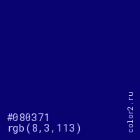 Цвет #080371 в цветовой модели RGB обозначается тремя октетами (8, 3, 113) в десятичном формате и #080371 в шестнадцатиричном (hex) формате, которые являются интенсивностью красного 8 (hex 08), интенсивность зелёного 3 (hex 03) и интенсивность синего 113 (hex 71).