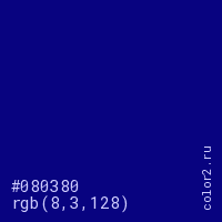Цвет #080380 в цветовой модели RGB обозначается тремя октетами (8, 3, 128) в десятичном формате и #080380 в шестнадцатиричном (hex) формате, которые являются интенсивностью красного 8 (hex 08), интенсивность зелёного 3 (hex 03) и интенсивность синего 128 (hex 80).