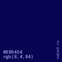 Цвет #080454 в цветовой модели RGB обозначается тремя октетами (8, 4, 84) в десятичном формате и #080454 в шестнадцатиричном (hex) формате, которые являются интенсивностью красного 8 (hex 08), интенсивность зелёного 4 (hex 04) и интенсивность синего 84 (hex 54).