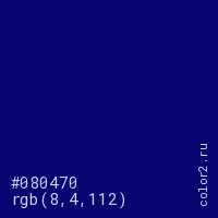 Цвет #080470 в цветовой модели RGB обозначается тремя октетами (8, 4, 112) в десятичном формате и #080470 в шестнадцатиричном (hex) формате, которые являются интенсивностью красного 8 (hex 08), интенсивность зелёного 4 (hex 04) и интенсивность синего 112 (hex 70).