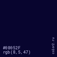 Цвет #08052F в цветовой модели RGB обозначается тремя октетами (8, 5, 47) в десятичном формате и #08052F в шестнадцатиричном (hex) формате, которые являются интенсивностью красного 8 (hex 08), интенсивность зелёного 5 (hex 05) и интенсивность синего 47 (hex 2F).