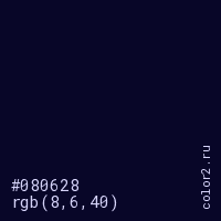 Цвет #080628 в цветовой модели RGB обозначается тремя октетами (8, 6, 40) в десятичном формате и #080628 в шестнадцатиричном (hex) формате, которые являются интенсивностью красного 8 (hex 08), интенсивность зелёного 6 (hex 06) и интенсивность синего 40 (hex 28).