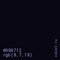 Цвет #080712 в цветовой модели RGB обозначается тремя октетами (8, 7, 18) в десятичном формате и #080712 в шестнадцатиричном (hex) формате, которые являются интенсивностью красного 8 (hex 08), интенсивность зелёного 7 (hex 07) и интенсивность синего 18 (hex 12).