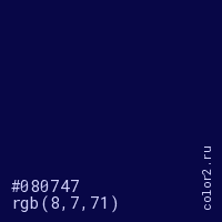 Цвет #080747 в цветовой модели RGB обозначается тремя октетами (8, 7, 71) в десятичном формате и #080747 в шестнадцатиричном (hex) формате, которые являются интенсивностью красного 8 (hex 08), интенсивность зелёного 7 (hex 07) и интенсивность синего 71 (hex 47).